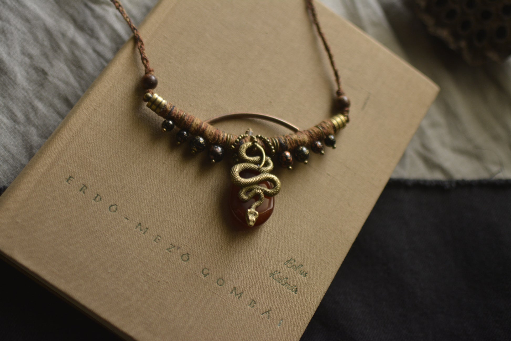 Handcrafted in the quiet mountains of Nógrád County, Hungary, this necklace features a snake pendant at its center, woven into intricate hemp and linen work that has become Intambo’s signature.